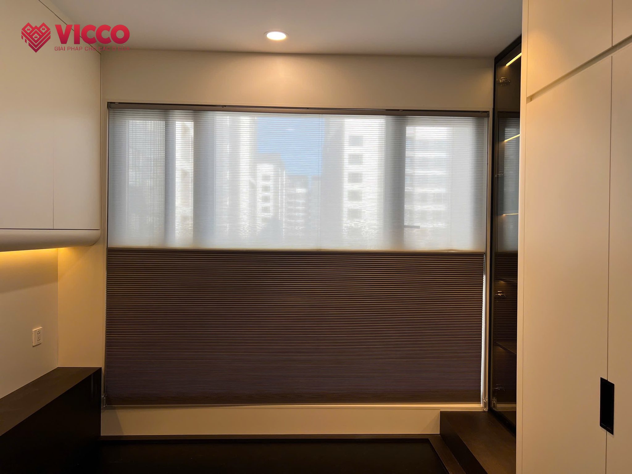 Trong các căn hộ chung cư hoặc không gian làm việc mở, việc phân chia các khu vực chức năng không cần thiết phải xây dựng vách ngăn cứng gây khó chịu, mà có thể sử dụng rèm tổ ong để tạo ra các vùng riêng biệt. Rèm hệ Day & Night giúp dễ dàng điều chỉnh không gian theo nhu cầu sử dụng, từ mở rộng không gian để đón ánh sáng tự nhiên đến tạo cảm giác riêng tư cho phòng ngủ hay phòng họp.