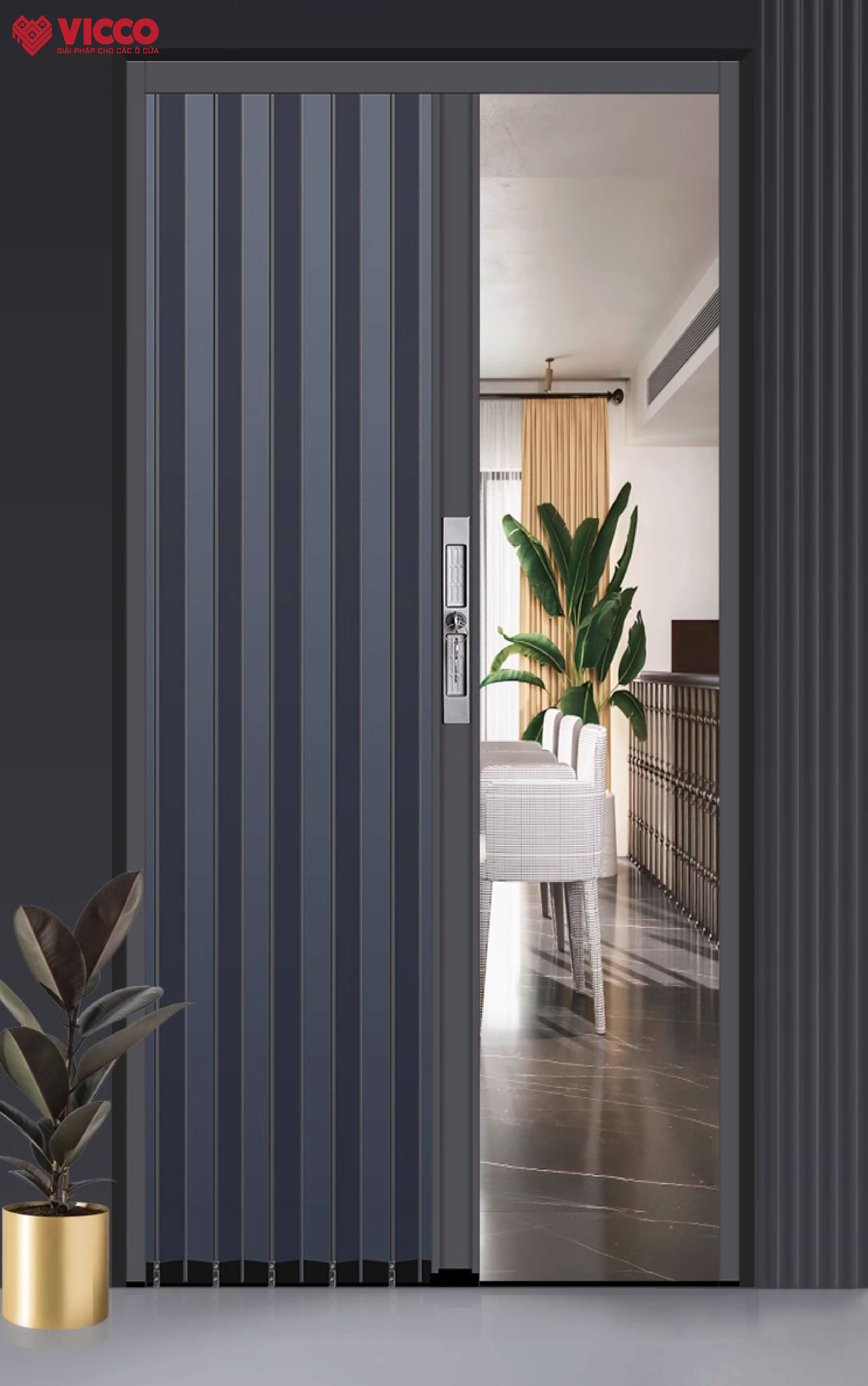 Cửa xếp lá nhôm đem lại vẻ đẹp hiện đại, tinh tế phù hợp với xu hướng thiết kế tối giản và hướng tới không gian mở. Đặc điểm của loại cửa này là các lá nhôm mỏng, mảnh mai, xếp gọn gàng khi mở ra, tạo cảm giác rộng rãi và thoáng đãng cho không gian phía sau.